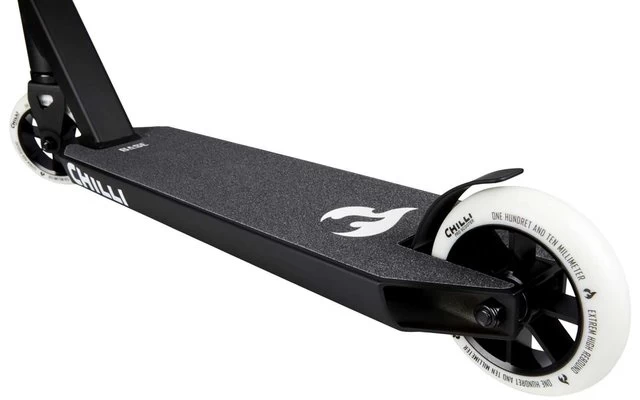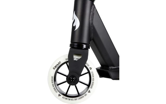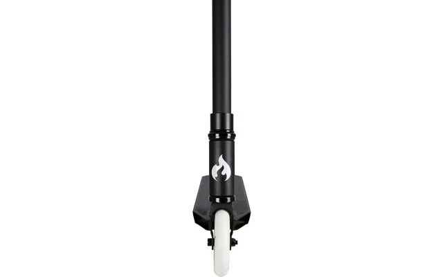 Zur Kompression verwenden wir bei diesem Modell ein Universal HIC um Gewicht zu sparen. Das rundet auch die schöne HIC Aluminium 2 bolt Klemme ab. Als Steuerlager werden sealed loose ball Kugellager verwendet. Ansprechend ist auch die farbliche Abstimmung der Griffe mit dem Rollen PU. Die Rollen selber sind 110mm im Durchmesser und der Rollencore besteht ebenfalls aus bestem 6061 Aluminium. Die Flex-Bremse besteht aus Stahl und wird von oben montiert. Die Gesamthöhe des Scooter ist 79cm.
