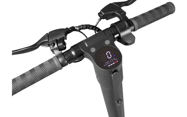 Lenkstange zeigt den Batterieladestand, sowie die aktuellen Fahrdaten an. Komfortabel zu transportieren und leicht zu verstauen. Ausstattung / Lieferumfang: LED Front- und Rücklicht, Klingel, Ladeadapter, Bedienungsanleitung, Reflektoren, Ständer, Halter für Versicherungsplakette.