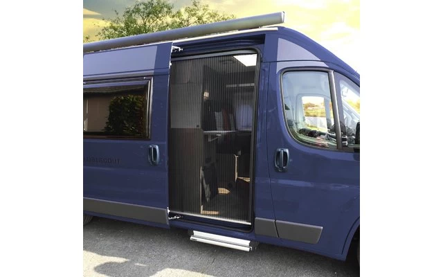 So sieht ein angenehmes, durchlüftetes Campingvergnügen ohne Mücken- oder Schnakenbesuch aus. Keine stickige Luft und keine schlaflosen Nächte durch herumsummende Mücken mehr – einfach Schiebetür auf und Plissee zu.