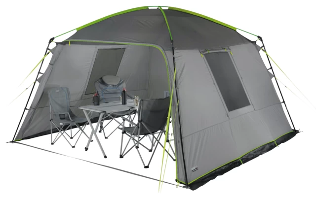 Der Pavillon bietet auf 12,25 m² mit einer Stehhöhe von 210 cm viel Platz. Die Reißverschluss-Verandafront lässt sich je nach Wetterlage halb und komplett öffnen. Ein Klarsichtfolienfenster mit Abdeckung bringt Licht in den Innenraum. Zwei große Moskitonetz-Fenster mit RV-Abdeckklappen belüften den Wohnbereich und halten Insekten fern. Die Dauerventilation belüftet auch an regnerischen Tagen und sollte immer geöffnet sein. Der Rundum Faulstreifen hält Schmutz und Feuchtigkeit ab.