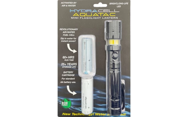 Die AquaTac Taschenlampe mit der neuen innovativen HC1D-Energiezellentechnologie sorgt ganz ohne Batterien für Licht. Das sichert die zur umweltfreundlichen Energieerzeugung genutzte elektrochemische Reaktion. Um die volle Zellen-Kapazität ausnutzen zu können, und auch die Laufzeit zu maximieren, muss die Energiezelle bei Nichtnutzung der Taschenlampe, quasi „zur Erholung“, aus dem Gerät entnommen werden. So wird stets die verfügbare maximale Zellenkapazität erhalten. Die Re-Aktivierung einer „erholten Energiezelle“ bringt dann wieder volle Leistungskraft.