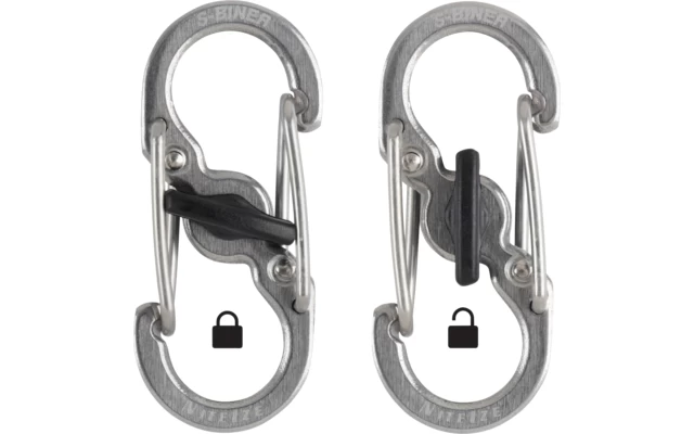 der mit einem einfachen Dreh hin beide Karabineröffnungen sicher verschließt und so ungewolltes Öffnen (und Verlieren) verhindert.