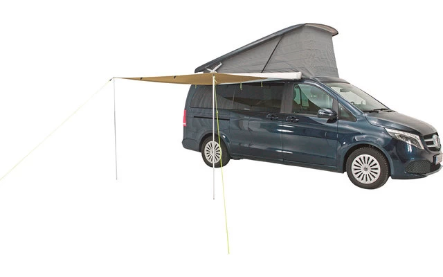 Das Outwell Hillcrest Tarp kann vielseitig genutzt werden. Mit den beiden Aufstellstangen kann es als normales Sonnensegel an Bussen mit Vorzeltschienen ausgespannt werden. Es kann auch direkt an die Front der Markisen eingezogen werden und gibt zusätzlichen Schatten bei tiefstehender Sonne, vergrößert den nutzbaren Raum bei Regen oder sorgt für zusätzlichen Sichtschutz. Oder es wird auf der gegenüberliegenden Seite des Busses eingezogen und verbessert die Performance des Kühlschranks.