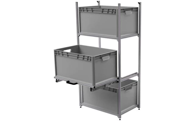Das Regal aus Aluminiumprofil wird zwischen Boden und Decke der Heckgarage geschraubt. Die beiden Regalböden können auf beliebige Höhe eingestellt werden, so entsteht ein individuelles Regal, ganz nach den Anforderungen in Ihrer Heckgarage. Die EuroBoxen (nicht im Lieferumfang enthalten) rasten im Regalboden ein und sind damit während der Fahrt automatisch gesichert. Die Regalböden nehmen EuroBoxen mit der Grundfläche 60 x 40 cm auf. Die Steher können mit einer Eisensäge auf die Höhe der Heckgarage angepasst werden. Made in Germany.